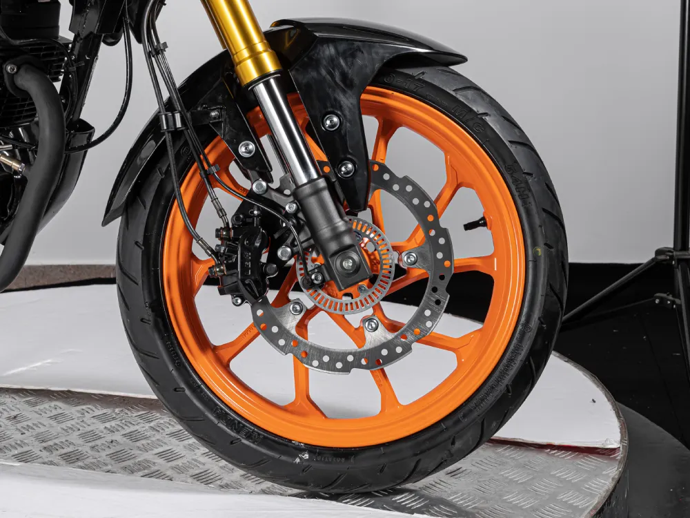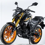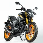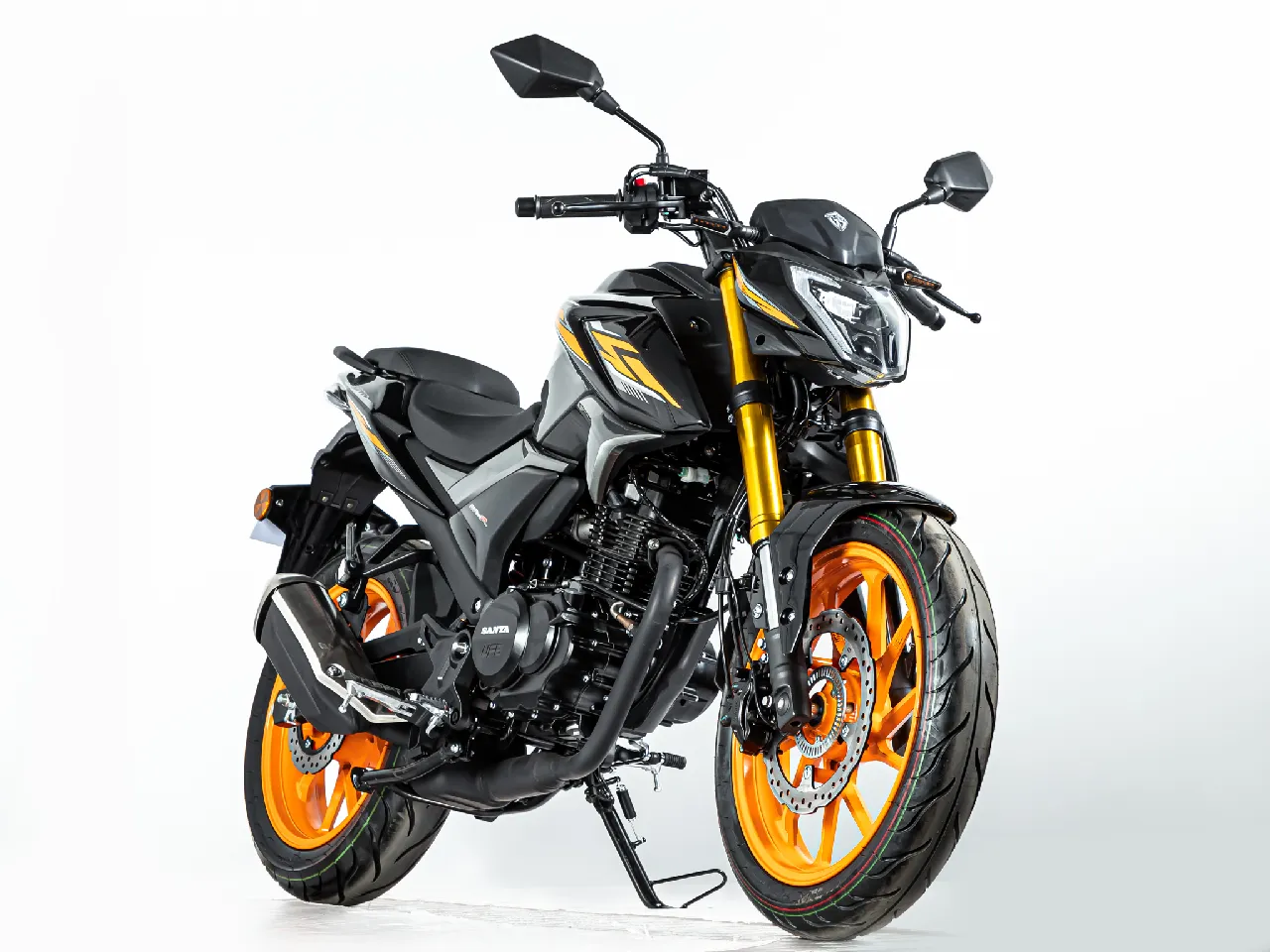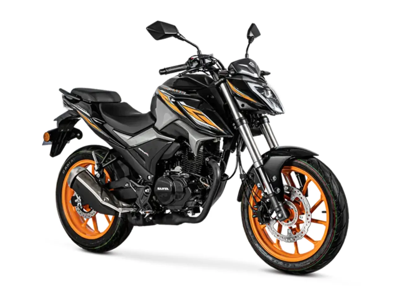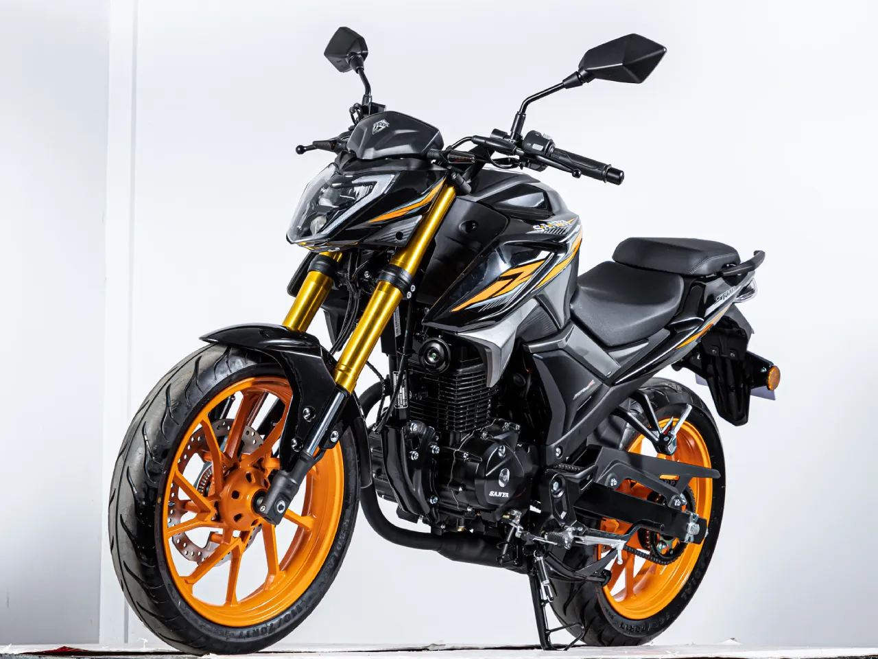 The Sanya GS200 is a sporty and stylish 200cc motorcycle that blends modern design with everyday practicality. It features a dynamic naked-bike aesthetic, with sharp lines and bold graphics that emphasize its agile character. The bike rides on striking alloy wheels—often finished in vivid colors—that complement its contrasting bodywork and add visual flair. Up front, inverted front forks and a muscular headlight assembly give it a confident stance, while the sculpted fuel tank and comfortable stepped seat provide both rider comfort and an athletic profile. Powered by a single-cylinder engine, the GS200 delivers balanced performance suitable for urban commuting and spirited weekend rides. Its contemporary features, including a refined exhaust, disc brakes, and ergonomic handlebars, make the Sanya GS200 an attractive option for riders seeking a fun, versatile mid-sized motorcycle.
